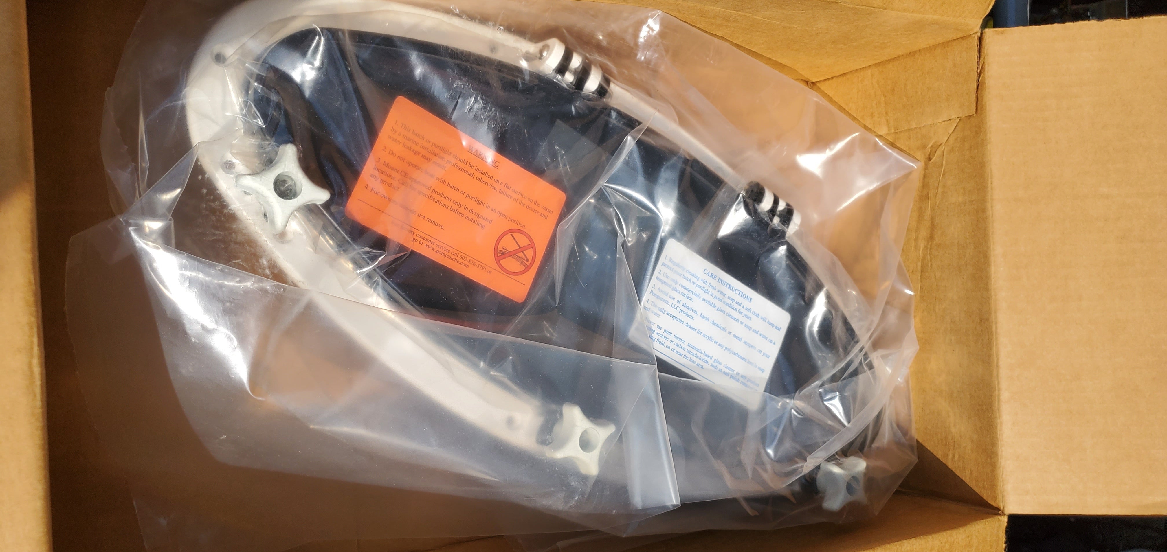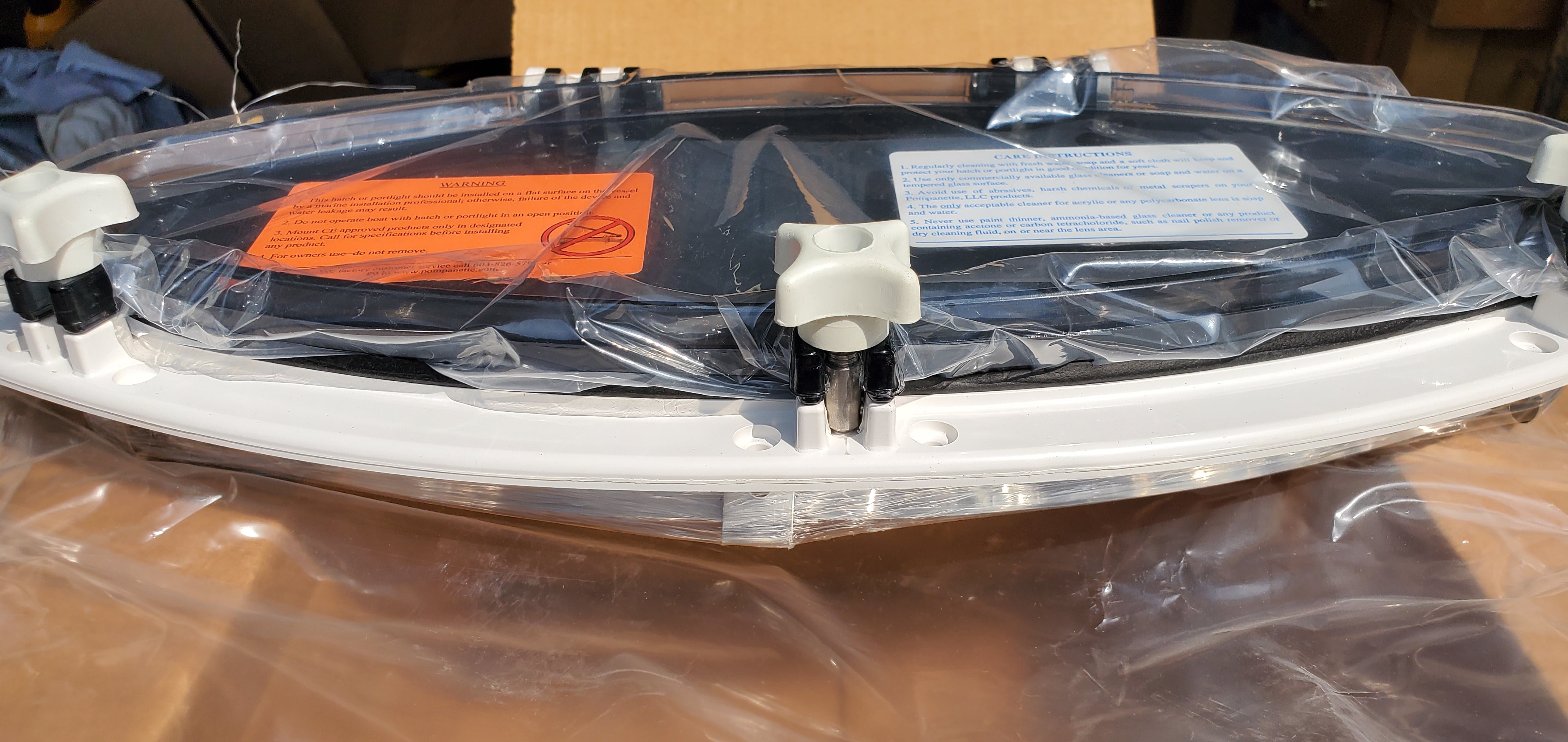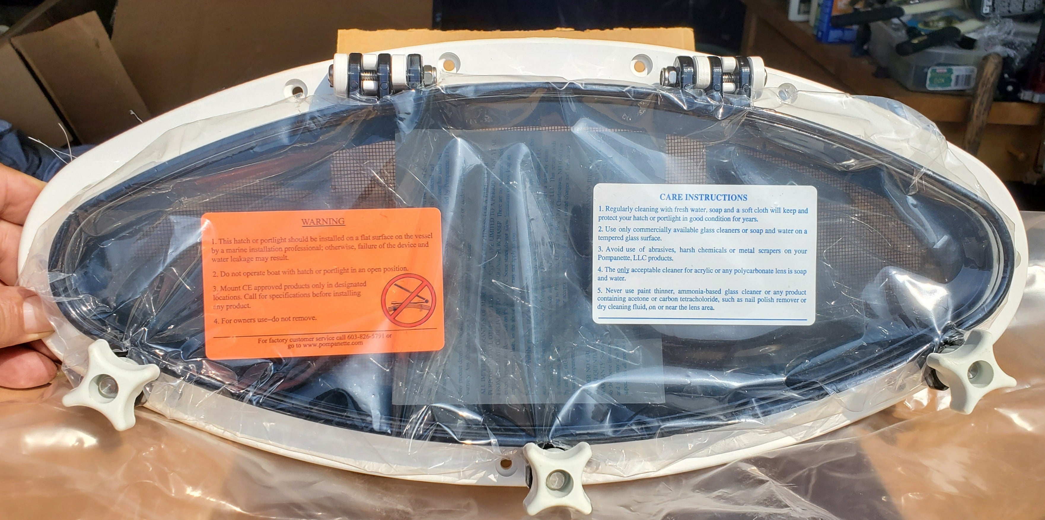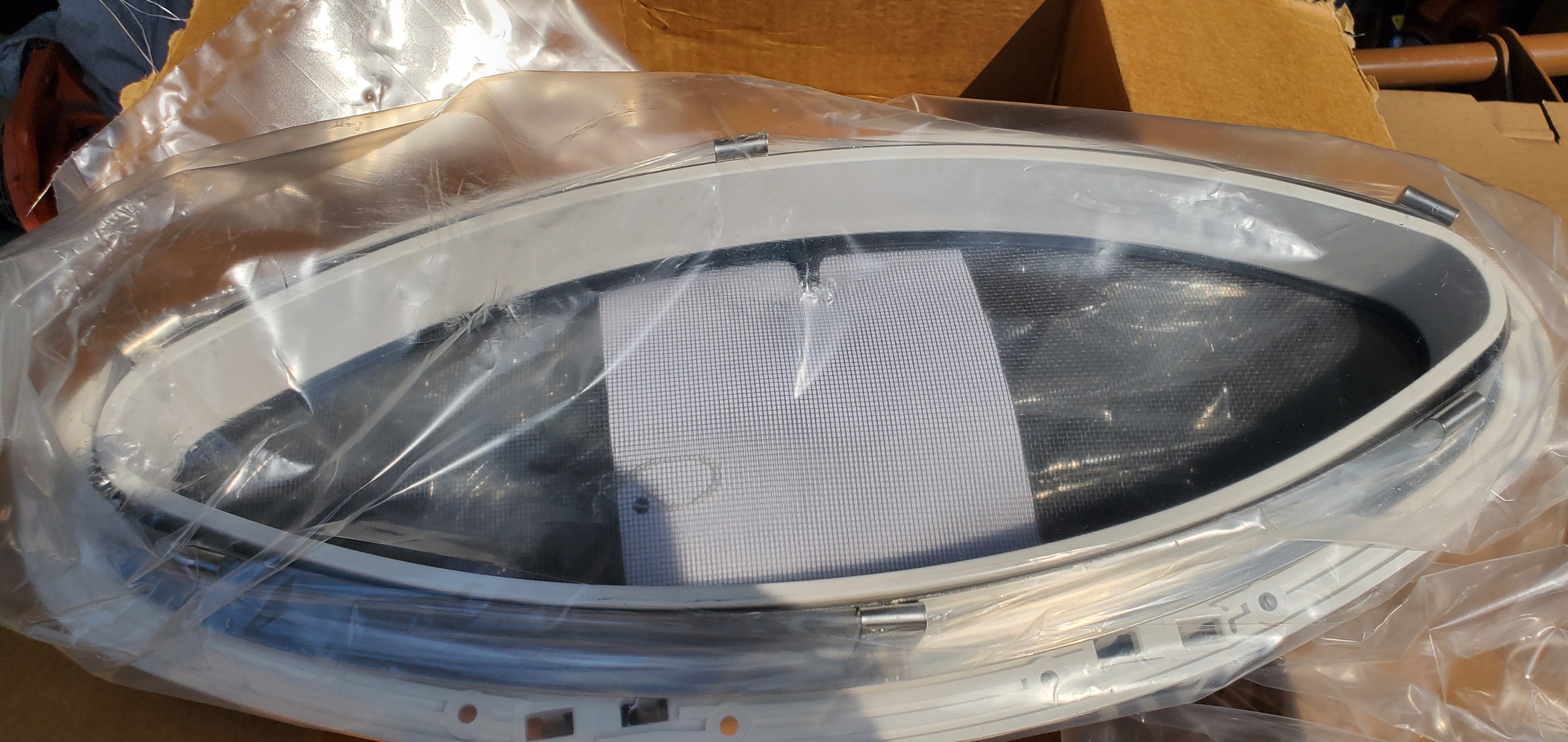 Bomar-Pompanette's stainless steel portlights open on friction hinges to any position. These are classic boat oval portlights with smoke tinted acrylic lens and a screen.