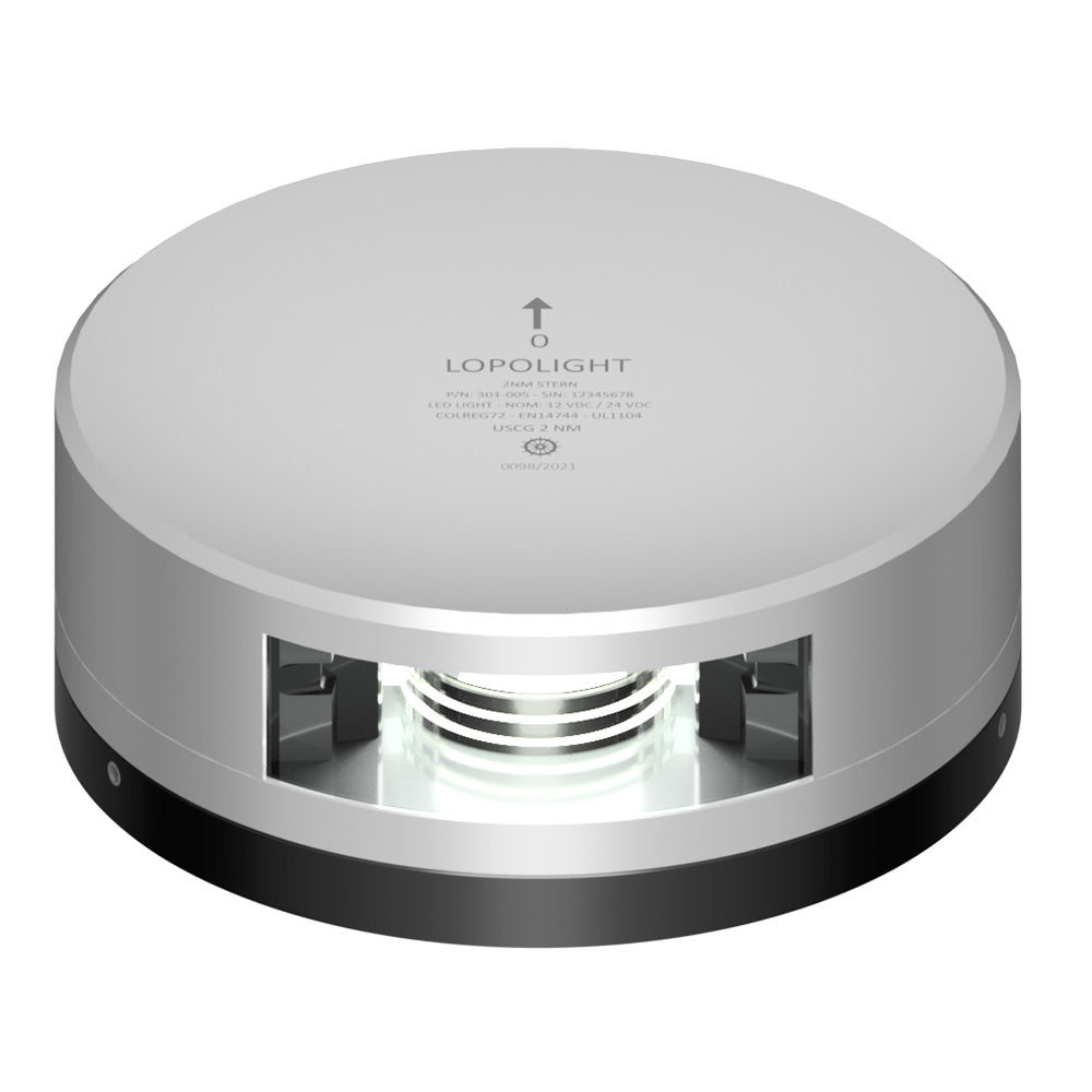 This white stern light has a silver housing, is horizontally mounted, and has a two-nautical-mile range. The FB base centers the wiring for antenna-type pole mountings. The base provides a screw-down onto the deck solution as well as a from-below mounting. Essentially, the base provides a sleeker, reduced profile.Â